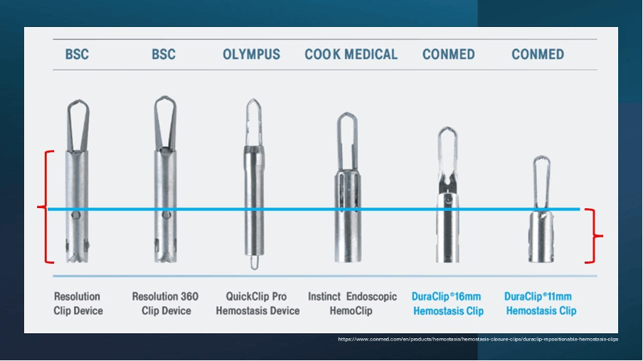 This patient had clear indication for endoscopic therapy: a) severe hemorrhage and b) lesion with high-risk stigmata. In this case we selected clips with short stems (or barrels) (yellow oval) to prevent luminal rubbing from the deployed clips (DuraClip). Figure 2 shows various commercially available clips and their stem lengths.