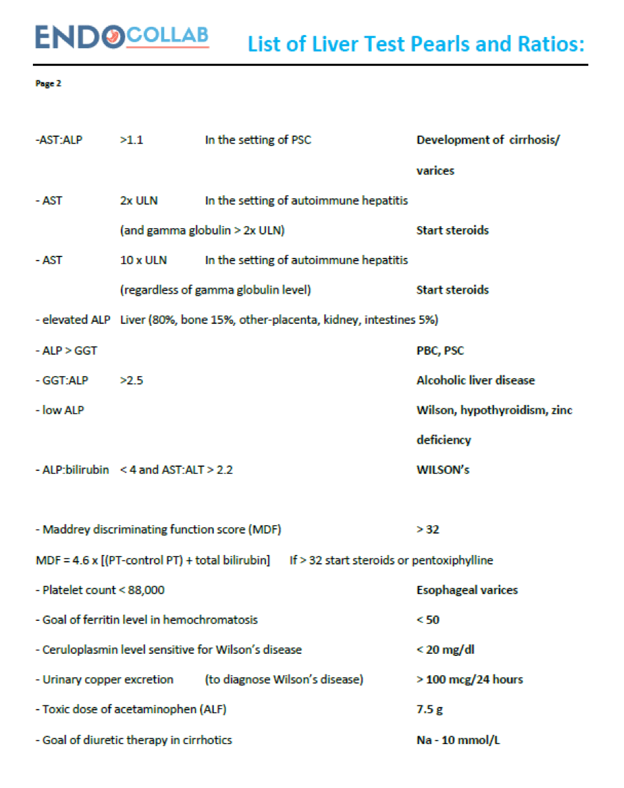 I hope this summary of liver tests, rations and some other liver-related values is useful for your practice. Of course, this list just represent a broad collection of data, based on clinical experience and literature review, especially for GI board preparation and does not constitute a certified guideline. Please feel free to add, correct and comment as needed. I am happy to receive feedback to continue expanding this list.