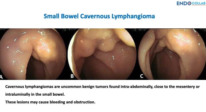 Cavernous lymphangiomas are uncommon benign tumors found intra-abdominally, close to the mesentery or in the small bowel.