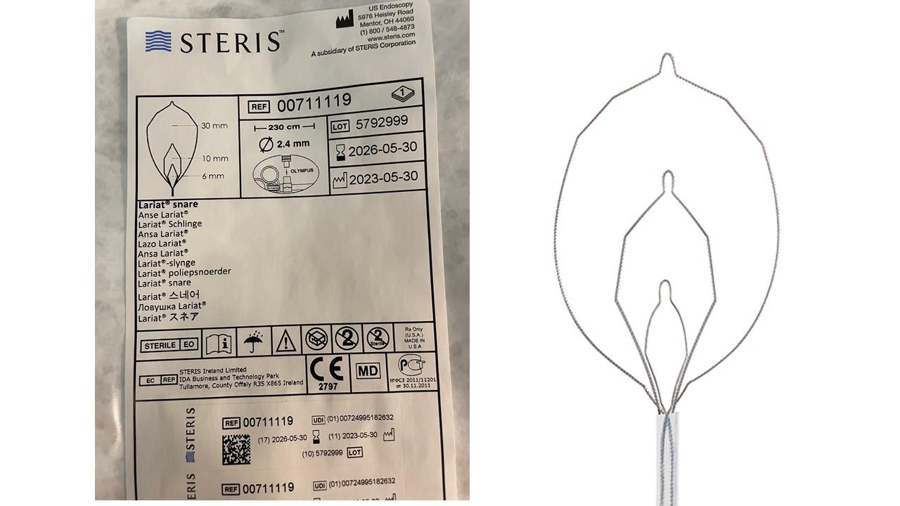 In this case we used a Lariat snare, which has the advantage of having three different sizes in one snare (Figure 3). Figure 1A shows the small size, Figure 2B (intermediate size), and in Figure 2C the larger size is shown. The small size opening is ideal for cold-snaring small lesions.