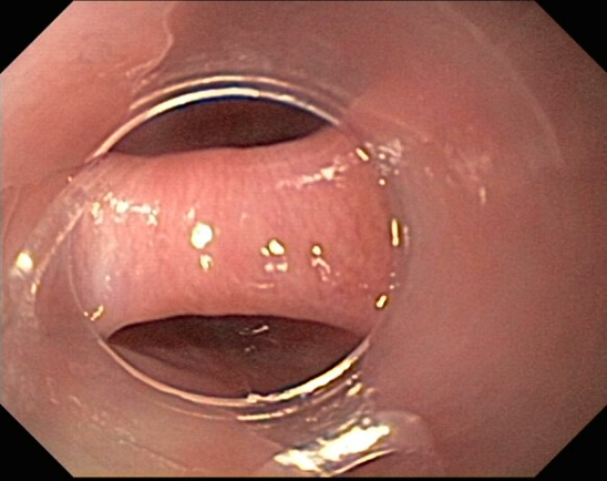 An elderly male presented with dysphagia to solid food, halitosis, and regurgitation. The patient also lost about 10-kg over a 6-month period. Subsequently, the patient underwent an EGD. Note the slit-like entrance to the esophagus. On the next image, a feeding tube is seen in the esophageal lumen. A thin feeding tube is advantageous when endoscopically resecting a Zenker diverticulum for the following reasons: